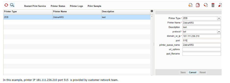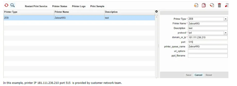 - Select printer type (DOCUMENT, ZEB, ESCP)